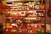 Verschillende soorten Italiaans vlees in een vitrine in de supermarkt in Italië. Welke zult u kiezen?