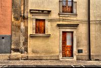 Een typische voorgevel van een huis in Italië in een hellende straat.