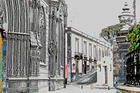 Juist door wat kleueren weg te laten komt de structuur van dit straatbeeld sterk naar voren.