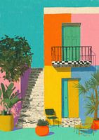 Deze gouache-illustratie toont een Italiaanse villa in levendige pastelkleuren. Een balkon en een pot met planten vullen het minimalistische ontwerp aan, terwijl meer groen leven en frisheid toevoegt aan het tafereel. De vlakke vormen en strakke lijnen creëren een kalme, moderne esthetiek die zowel klassieke architectuur als hedendaagse…