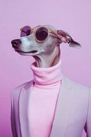 Elegantie in haar puurste vorm: Een Italiaanse windhond poseert met een chique zonnebril en een fluwelen coltrui, gehuld in pastelkleurige charme. Zijn slanke poten en sierlijke silhouet belichamen stijl en verfijning, terwijl zijn zachte, nieuwsgierige blik expressief in de camera straalt - een echte mode-ambassadeur op vier poten.