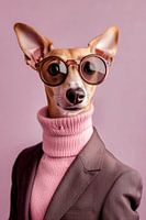 Een uiterst stijlvolle Italiaanse windhond met een net pak en een modieus roze vest belichaamt elegantie en charme. De grote, ronde bril voegt een speels accent toe, terwijl de sierlijke hoofddracht en het slanke lichaam een indrukwekkende aanwezigheid uitstralen. Een harmonieus samenspel van klasse en karakter dat ieders aandacht trekt.