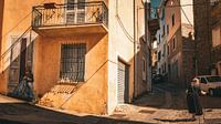 Een oud omaatje vindt haar weg door de steile straatjes van het Sardijnse dorpje Orgosolo. Ze wordt nagekeken door een de muurtekening van een ander Sardijnse oude dame. Dit dorpje staat bekend om haar vele muurtekeningen, vaak hyperrealistisch, politiek of historisch van aard.