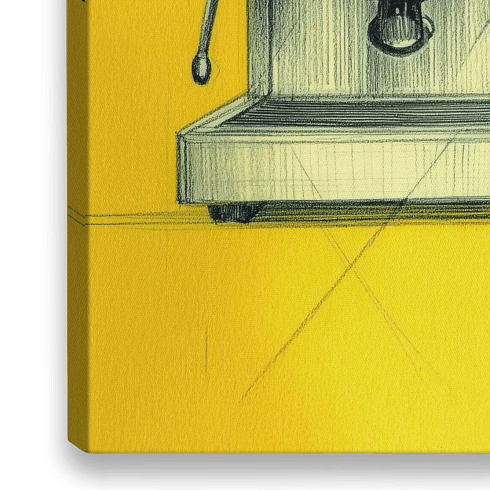 Barista kunst. Kleurrijk kunstwerk van een italiaanse koffie machine met een kop koffie. Perfect kunstwerk voor in de keuken of voor een enthousiaste barista. Dit limoen en citroen kleurige werk geeft kleur en expressie aan elke ruimte.