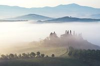 Het iconische Podere Belvedere in Val d'Orcia, Toscane, ligt te midden van glooiende heuvels gehuld in ochtendmist. Cipressen en olijfbomen omlijsten het charmante landhuis en benadrukken de tijdloze schoonheid van het Toscaanse landschap. Een adembenemend panorama dat de rust en magie van deze streek weerspiegelt.