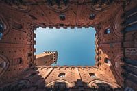 Indrukwekkend uitzicht op de Campanile (klokkentoren) in Siena, Toscane, van onderaf. De gedetailleerde architectuur van de middeleeuwse toren rijst majestueus op in de lucht, omgeven door de unieke sfeer van de historische stad. Het perspectief benadrukt de hoogte en elegantie van het gebouw en nodigt uit tot verwondering.