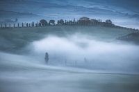 Langs een smalle weg of oprijlaan leidt een majestueuze laan van cipressen naar de boerderij, waarvan de slanke silhouetten afsteken tegen de mistige achtergrond. De cipressen staan als bewakers van het landgoed en voegen een extra dimensie van schoonheid en elegantie toe aan het tafereel.