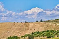 Italië Toscane hooibalen in het landschap. Een natuurbeeld van een landschap in zuid-Toscane. In het hart van Italië prijkt Toscane met haar adembenemende landschappen. Golvende heuvels bedekt met eindeloze wijngaarden, oude olijfgaarden en schilderachtige cipressen. Charmante dorpjes met geplaveide straatjes nestelen zich tussen glooiende valleien. Het landschap van Toscane betovert met haar tijdloze schoonheid en wekt de ziel tot leven.