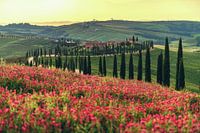 Glooiende heuvels en pittoreske wijngaarden strekken zich uit op de achtergrond, verlicht door de warme Toscaanse zon. De lucht is helderblauw met een paar witte wolken die over het landschap drijven, wat het geheel een idyllische en vredige sfeer geeft.