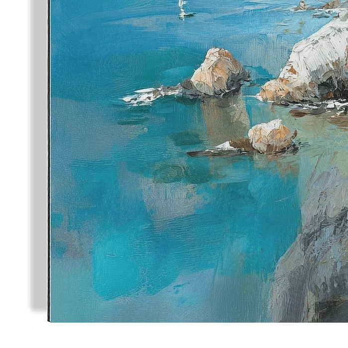 Details: Italie, Amalfi, Mediterrane kustlijn, kustlandschap, abstract schilderij, moderne kunst, zeezicht, kustschilderij, blauwe wateren, pittoreske huisjes, artistieke weergave, natuurlijke schoonheid