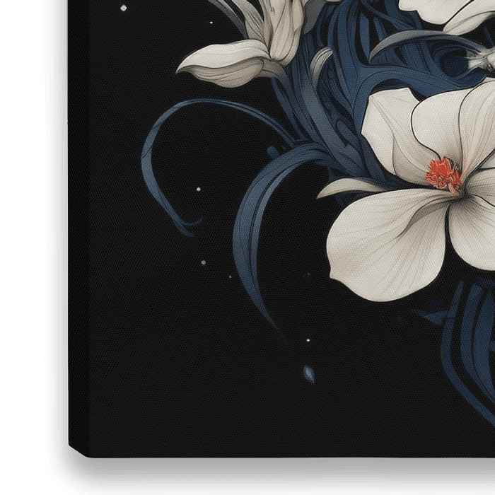 Dit krachtige kunstwerk toont een statige olifant, centraal en symmetrisch geplaatst, omgeven door een bloei van witte lelies en slingerende planten tegen een diepzwarte achtergrond.