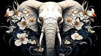 Dit krachtige kunstwerk toont een statige olifant, centraal en symmetrisch geplaatst, omgeven door een bloei van witte lelies en slingerende planten tegen een diepzwarte achtergrond.