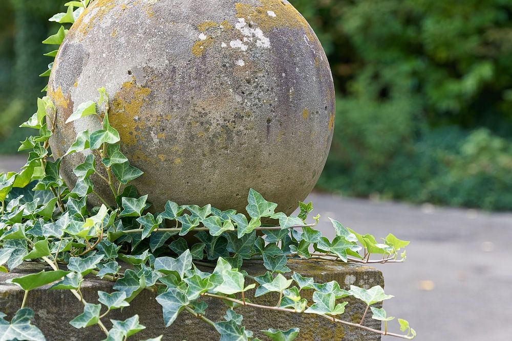 Ivy-covered column met bal als decoratie op een pad in een openbaar park