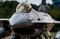 De Nederlandse Lockheed Martin F-16, de J-006, staat klaar op luchtmachtbasis Volkel om te vertrekken.