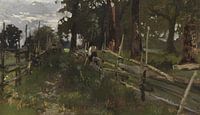 Landschap met een jongen op een hek rond een weide of wei van een boerderij.
