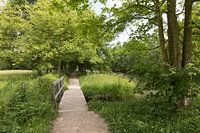 Jaagpad langs de Kromme Rijn bij Amelisweerd op een zomerse dag. Het pad loopt via een bruggetje.