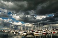 Heftige wolkenlucht boven de jachthaven van Breskens gelegen aan de Westerschelde in Zeeuws Vlaanderen. De zon gaf nog prachtig licht op de plezierjachten en het spiegelende water in de haven.