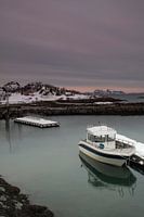 Een vissersboot ligt in het jachthaventje van het dorpje Botnhamn op het eiland Senja in het noorden van Noorwegen boven de Poolcirkel.