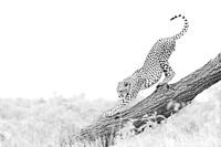 Dit mannetje klom op de boomstam om zich eens goed uit te rekken. In deze foto is duidelijk zichtbaar hoe atletisch jachtluipaarden zijn gebouwd. Met zijn lange poten, lange staart en ranke bouw, is dit het snelste landdier ter wereld. Hij kan tot wel 100km/u rennen! De foto is bewust in zwart-wit, zodat het patroon van zijn vacht goed…
