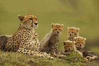 Een moeder Cheeta, of jachtluipaard, met 4 jongen op de Afrikaanse savanne. De Cheeta is het snelste landdier ter wereld en komt nog voor in Afrika en Iran(daar zeldzaam).