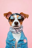 Met zijn stijlvolle zonnebrillook en charmante halsdoek straalt deze Jack Russell Terrier stoerheid uit. Het spijkerjasje geeft hem een hippe, levendige flair, terwijl de levendige oren en gespannen blik zijn speelse, energieke aard benadrukken. Een echt fashion statement in het hondenuniversum!