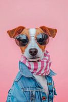 Met een coole zonnebril op zijn snuit en een casual spijkerjasje toont deze Jack Russell Terrier een echt gevoel voor stijl. Een gestreepte sjaal om zijn nek zorgt voor de finishing touch, terwijl de roze achtergrond vulkanische energie en joie de vivre uitstraalt. Deze kleine rebel is klaar om de modewereld te veroveren!