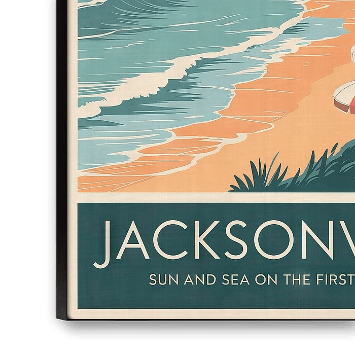 Palmbomen flaneren langs de gouden kust in de zachte bries, terwijl kleurrijke parasols ontspannen op het zand staan. Het rustgevende blauw van de zee en de warme zon creëren een uitnodigende sfeer. Dit kunstwerk is perfect voor een woonkamer en brengt een vleugje vakantiestemming en ontspanning in elke kamer.