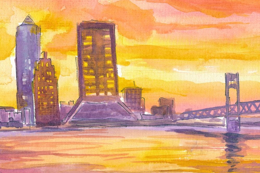 Jacksonville skyline licht op bij zonsondergang met rivierreflecties