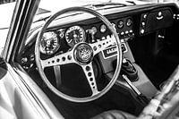Jagauar E-type klassiek sportwageninterieur en dashboard met een groot, driespaaks houten stuurwiel, met een aluminium middenstuk met het iconische Jaguar growler-embleem en lederen bekleding. De Jaguar E-Type is een Britse sportwagen die van 1961 tot 1975 door Jaguar Cars werd geproduceerd. Hij wordt algemeen beschouwd als een van de mooiste en meest iconische auto's aller tijden, geprezen om zijn combinatie van prestaties, design. Zwart-wit retrofoto.