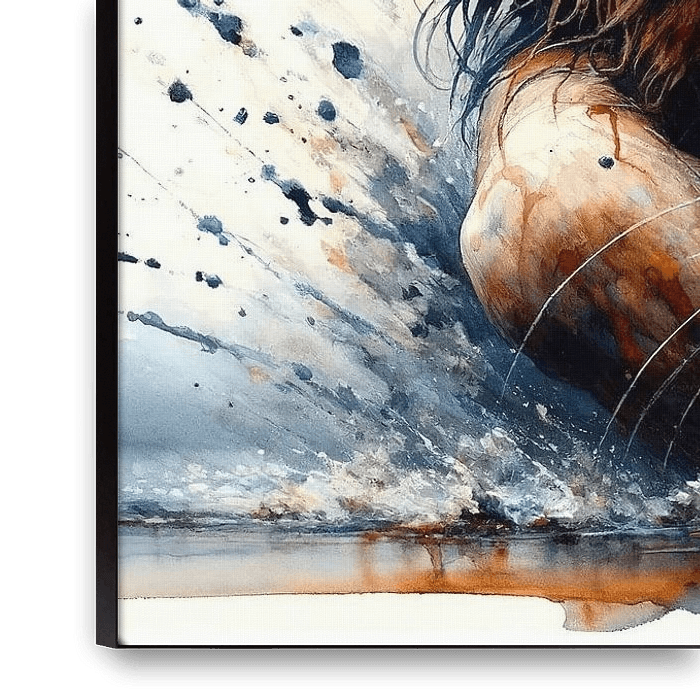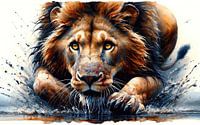Een leeuw is midden in beweging vastgelegd, laag bij de grond met zijn poten die door ondiep water snijden. Het gezicht domineert de scène, omlijst door een winderige manen en scherpe snorharen die afsteken tegen zachte wassingen en open ruimte. Warme goud- en kopertinten lopen door de vacht, terwijl koelere blauwgrijze schaduwen en…