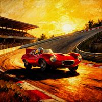 In mijn geestesoog was de scène een symfonie van licht en snelheid. Ik moest het vastleggen. Dit schilderij is mijn eerbetoon aan een legendarisch moment in de klassieke autosport. Het onderwerp is de iconische Jaguar Type D Racing uit 1956, met zijn levendige rode vorm als een flits van schittering tegen de steeds schemeriger wordende achtergrond van het circuit van Le Mans. Met elke penseelstreek probeerde ik de rauwe kracht en de gestroomlijnde, aerodynamische schoonheid van deze machine over te brengen. De ondergaande zon verspreidt goud en oranje over het doek, vangt de rondingen van de auto en werpt lange, dramatische schaduwen op het circuit.