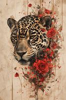 "Jaguar Essentie - Rozen in Rebel" is een artistieke weergave van een jaguar wiens gezicht subtiel tevoorschijn komt uit een dynamisch veld van rode rozen en abstracte vormen. Het spel tussen de scherpe blik van de jaguar en de wilde, vurige rozen weerspiegelt een gevoel van passie en kracht. Dit stuk zou een onmiskenbaar middelpunt zijn in een ruimte, ideaal voor het toevoegen van een vleugje wildheid en romantiek.
