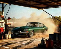 Dit schilderij vangt de rauwe essentie van snelheid, precisie en vakmanschap. Als kunstenaar wilde ik de Jaguar Type E Racing uit de jaren 60 vereeuwigen - een machine die elegantie en kracht belichaamt. De auto, geschilderd in een diep, glanzend groen, staat in het middelpunt met zijn slanke rondingen en chromen accenten die de gouden…