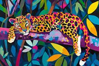 Een majestueuze luipaard troont op een met takken bedekte boom in het midden van een levendige jungle. Zijn opvallende, lichtgevende vacht glanst in een fascinerend samenspel van geel, oranje en zwart. Ingelijst door weelderig, kleurrijk gebladerte wordt hij een stille observator van het pulserende leven terwijl hij ontspannen en indrukwekkend naar buiten kijkt.
