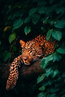 Een majestueuze luipaard verbergt zich tussen het dichte, groene gebladerte. Zijn goudgele vacht glinstert met een netwerk van donkere rozetten terwijl hij nonchalant op een tak rust. De glanzende ogen, vol intelligentie en kalmte, lijken aandachtig de omringende wildernis te observeren - een perfect beeld van gratie in de natuur.
