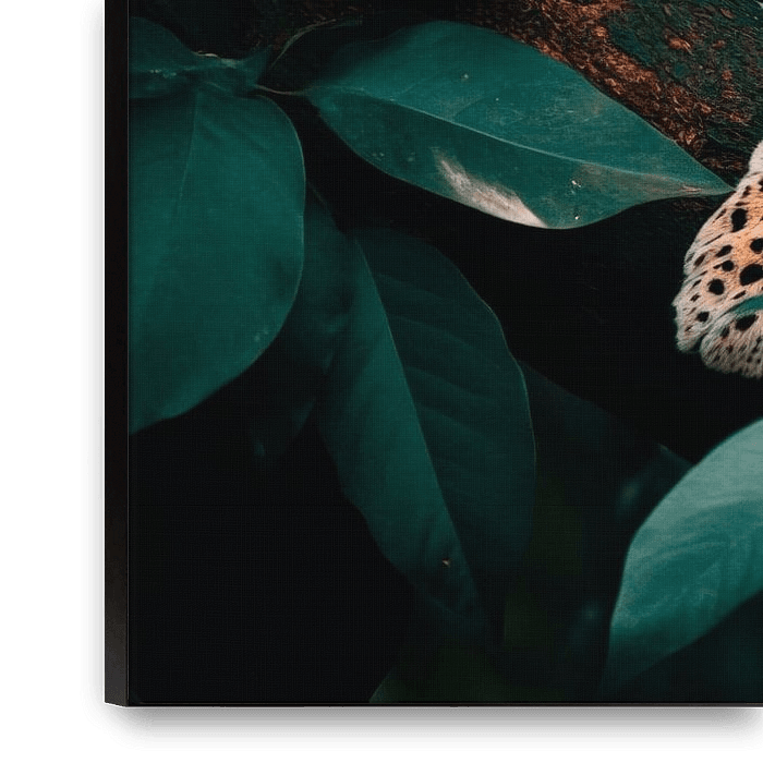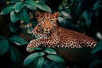 Een majestueus wezen troont tussen het weelderige gebladerte, zijn zijdeachtige vacht gaat harmonieus op in de omgeving. De gedurfde, okerkleurige vlekken steken fel af tegen de groene bladeren, terwijl de intense ogen vol wijsheid en gratie de kijker binnendringen. Deze stijlvolle grote kat straalt zowel kalmte als majestueuze kracht…