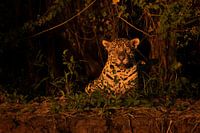 Een jaguar rust uit in het allerlaatste daglicht in Pantanal, Brazilie
