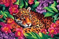 Een majestueuze jaguar nestelt zich zachtjes tussen heldere orchideeën en weelderig groen, zijn blik mysterieus en diep. Deze levendige afbeelding brengt een exotische sfeer in elke kamer. Ideaal voor in de woonkamer, voegt het een uitnodigend tintje toe en inspireert tot dromerige gesprekken over verre landen en avonturen.