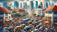 Dompel jezelf onder in het dynamische hart van Jakarta, Indonesië. Het doek geeft een levendig beeld van de drukke straten, waar het wemelt van het diverse verkeer en voetgangers te midden van het ijverige management van talloze verkeersregelaars. Deze chaos getuigt van Jakarta's dichte bevolking, die de verkeersellende van de stad nog verergert. De achtergronden bieden een schril contrast tussen torenhoge moderne wolkenkrabbers en traditionele architectuur, wat de culturele en economische diversiteit van de stad' onderstreept. Te midden van de stedelijke hectiek komen de kleuren van Jakarta tot leven, wat het levendige karakter van de stad' benadrukt. De voorgrond onthult op subtiele wijze de verborgen juweeltjes van de stad - historische monumenten en bruisende lokale markten waar mensen met verschillende achtergronden dagelijkse activiteiten ontplooien. De illustratie vangt niet alleen de essentie van Jakarta's hectische tempo, maar viert ook de harmonieuze co-existentie van moderniteit en traditie in deze bloeiende metropool.