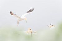 Jan Van Gent vliegend op zoek nr zijn partner vrouwtje/manneke; Op Helgoland is dit een fantastische ervaring deze vogels van dicht bij te kunnen waarnemen en fotograferen. Northern Gannets *Morus bassanus*