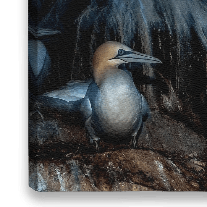 Een Jan-van-Gent landt bij zijn vrouwtje op het nest op een eiland voor de kust van Ierland