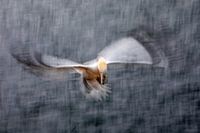 Jan van Gent in Helgoland genomen met een langere sluitertijd, dit geeft een artistieke uitstraling. De Jan van Gent leeft daar in een grote kolonie om te paren en te broeden. De mannetjes leveren nestmateriaal aan.