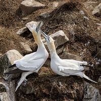 Een paartje Jan van Genten die elkaar liefdevol begroeten op de rotsen van Newfoundland.