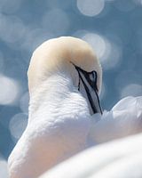 Op een zonnige voorjaarsdag op het Duitse eiland Helgoland, poetst een Jan-van-Gent zijn veren. Op de achtergrond zie je de glinstering van het zonlicht in de zee.