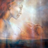 Een mooie jonge vrouw met een dromerige blik. De stemming is mysterieus. Een blauw doorschijnend zeeniveau, verschillende meeuwen vliegen op. Verlangen naar vrijheid.