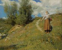 Het schilderij "Lied van de herderin" van Janis Rozentāls uit 1898 toont een serene scène in een idyllisch landschap. De herderin staat in een weelderig groen veld, omgeven door bloemen en struiken. Ze draagt een lange, witte blouse en een lange rok. In haar hand houdt ze een mand, en ze zingt een lied. De achtergrond bestaat uit een prachtig landschap met bomen en een helderblauwe lucht met enkele witte wolken. Het schilderij straalt een gevoel van rust en natuurlijke schoonheid uit, en benadrukt de harmonie tussen de herderin en haar omgeving.