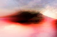 Een abstract berglandschapschilderij van zachte organische geometrische bergvormen met lichte expressionistische textuur in magenta, rood, grijsblauw, wit, ivoor, grijs, warm grijs, inktzwart, houtskoolzwart en beige kleuren met een impressie van Japanse kunst en kunst uit Noord-Europa.