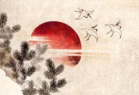 Een Japans kraanvogellandschap met zonsondergang als schilderij op elegante Japanse papieren achtergrond.