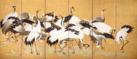 Een Japans kraanvogellandschap als schilderij op een elegante bladgouden achtergrond in het populaire panoramaformaat.