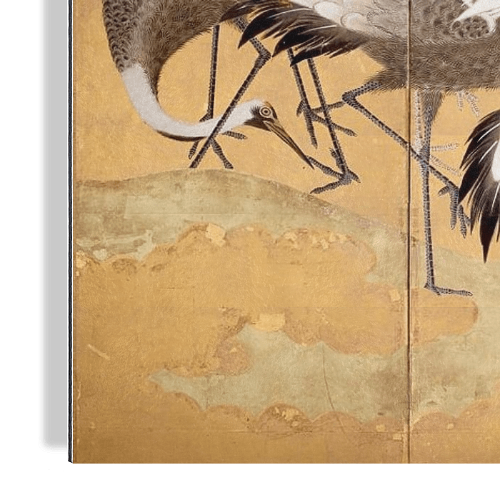 Een Japans kraanvogellandschap als schilderij op een elegante bladgouden achtergrond in het populaire panoramaformaat.